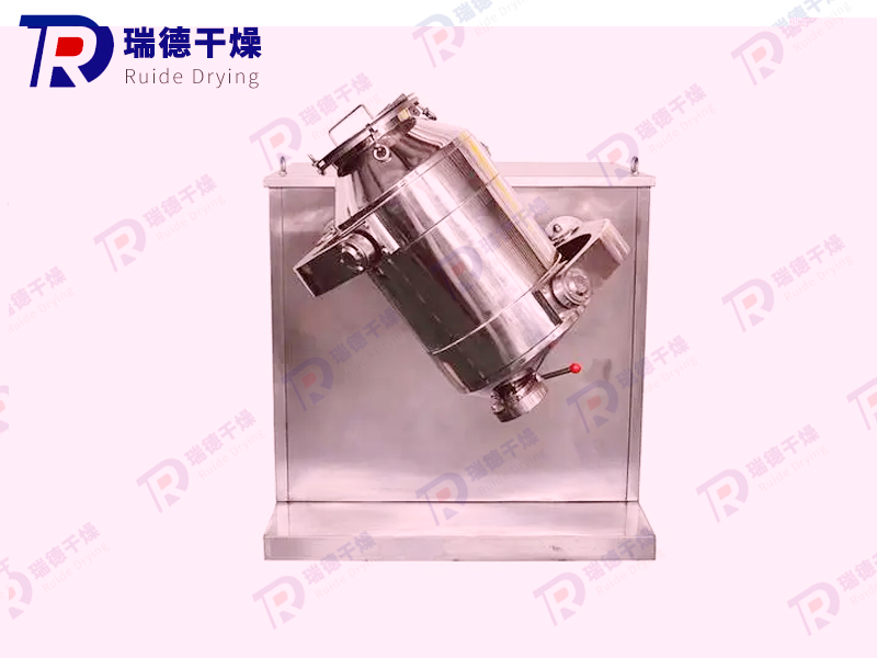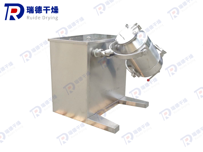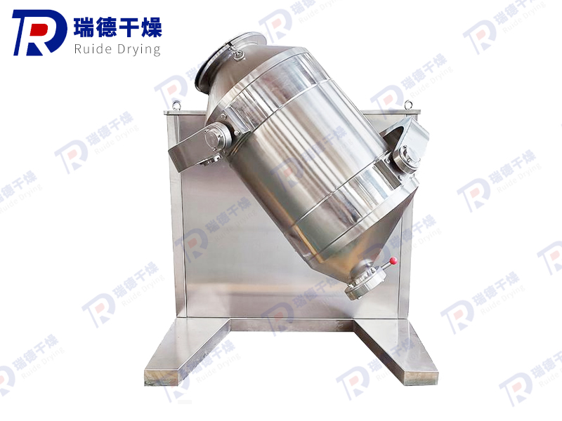 The 3D motion mixer consists of a machine base, transmission system, electrical control system, multi-directional motion mechanism, mixing bucket and other components. The mixing bucket that comes into direct contact with the material is made of stainless steel material, and the inner and outer walls of the bucket are polished.