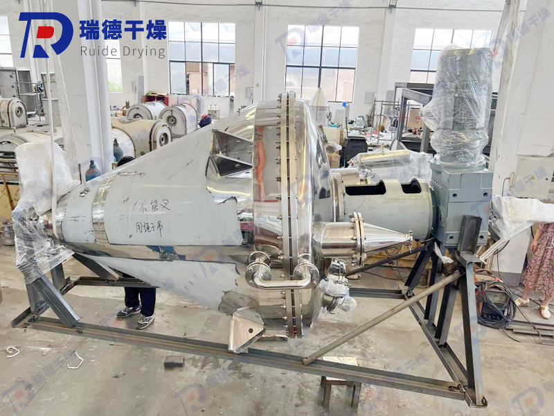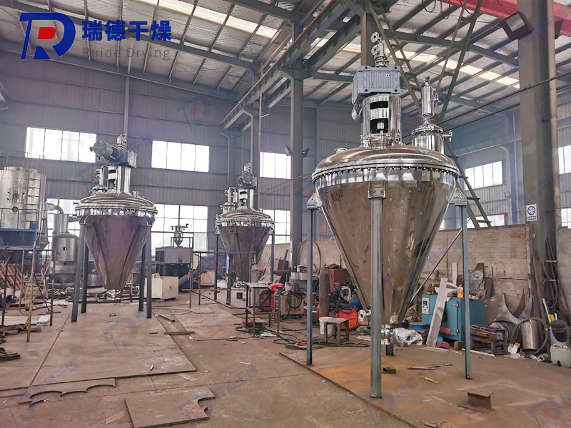 1、單錐真空干燥機工作過程為間歇批操作,濕物料進入料倉后,通過筒壁夾套和螺旋槳內部給熱,使給熱面積達到整個容器面積的140%,對物料進行升溫干燥。并選擇相應的錐型干燥混合器型號(工作容積)達到理想的干燥效果。采用上驅式結構的混合干燥機具有高效干燥、混合能力的同時,具有空間充裕,更便于使用者進行檢修維護的特點。